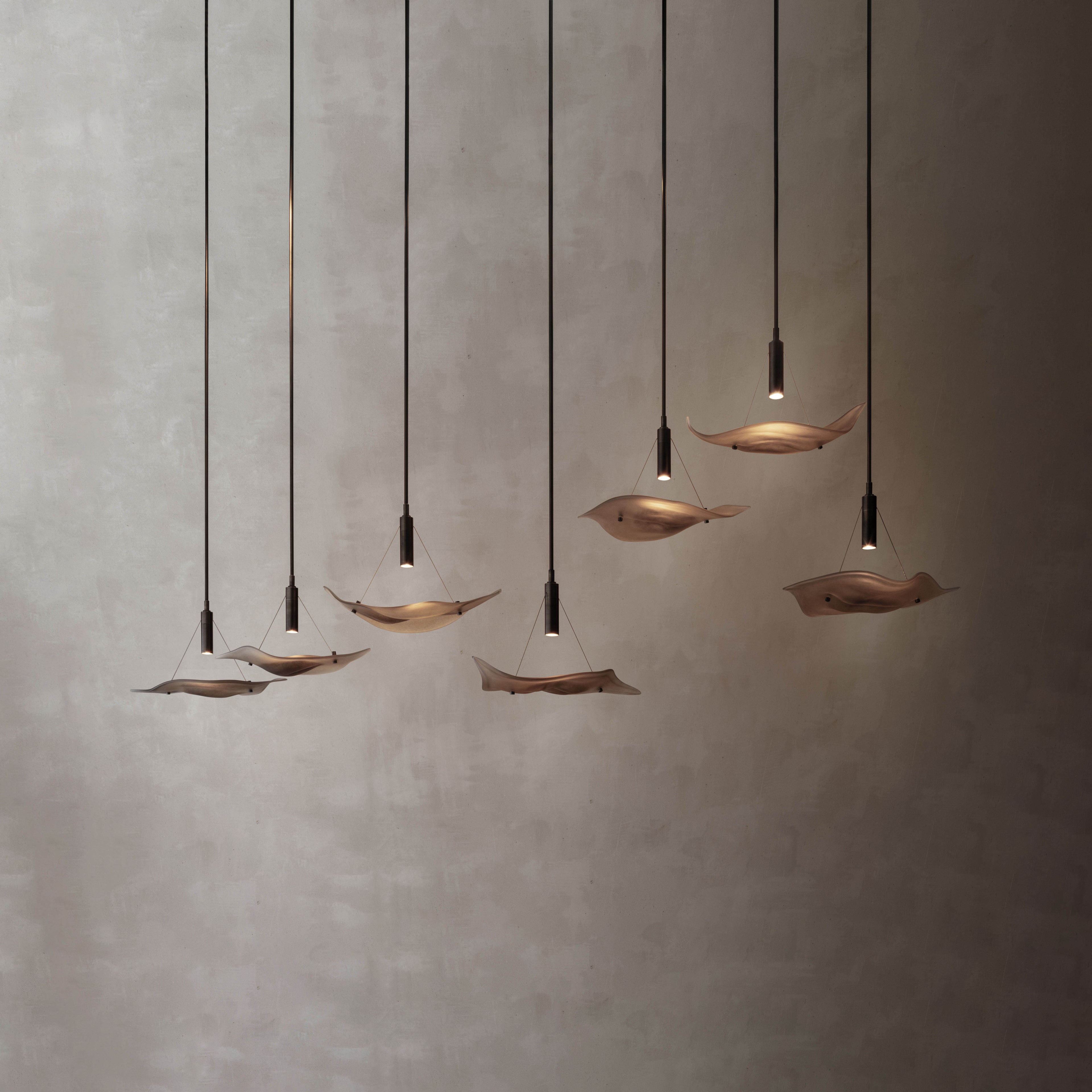 Fy-shan Glass Studıo'nun aydınlatma tasarımları ışık, doku ve formun katmanlı, akıcı ve dinamik heykelsi keşifleridir. Kalıpla şekillendirme, füzyon ve üfleme teknikleri kullanan stüdyo, camı, ışık kaynağını çoğaltmaya ve süzmeye yönelik şekillendirirken, tasarımlarını mekanlara derinlik ve ambiyans katan parşalara dönüştürüyor.