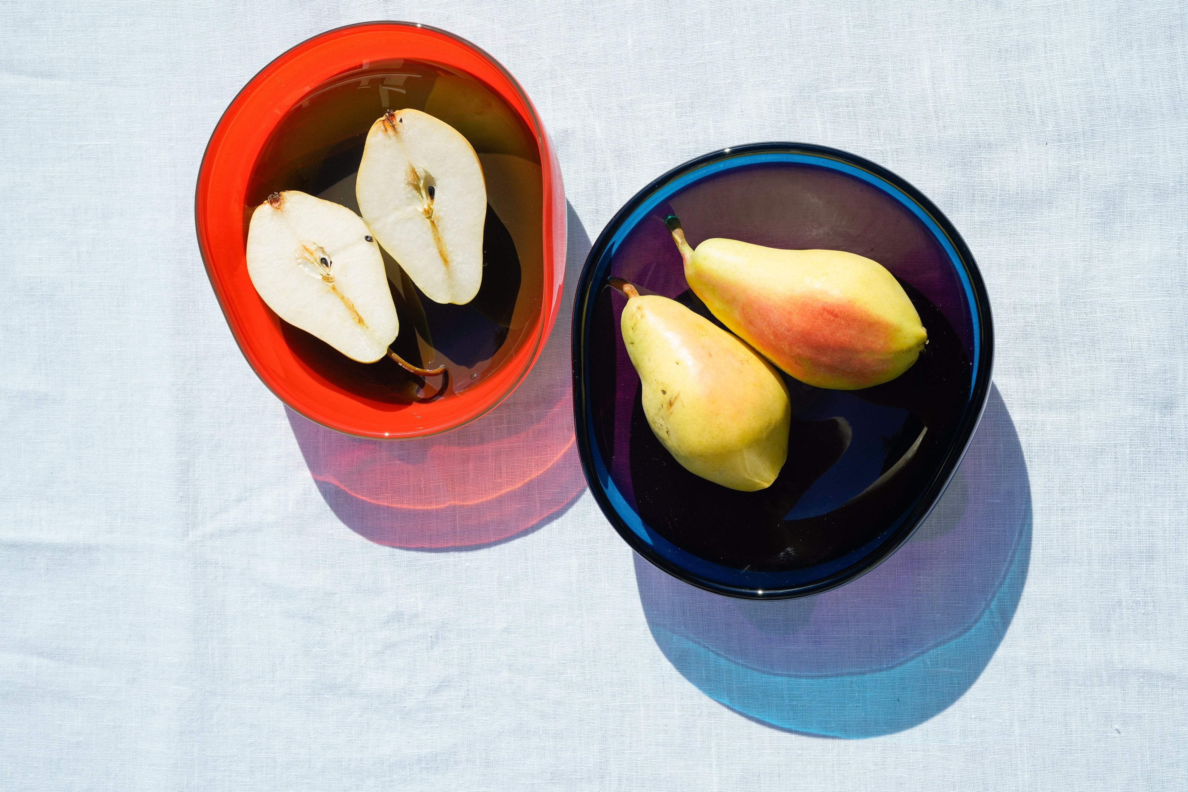 Sıcak şekillendirilmiş, çift renkli cam kaselerin her biri, özen ve titizlikle üretilmiş biricik parçalardır. Sıcak şekillendirmede objeye yapılan son bir el dokunuşu imza niteliğinde, süreci somutlaştıran benzersiz bir karakter vermektedir.