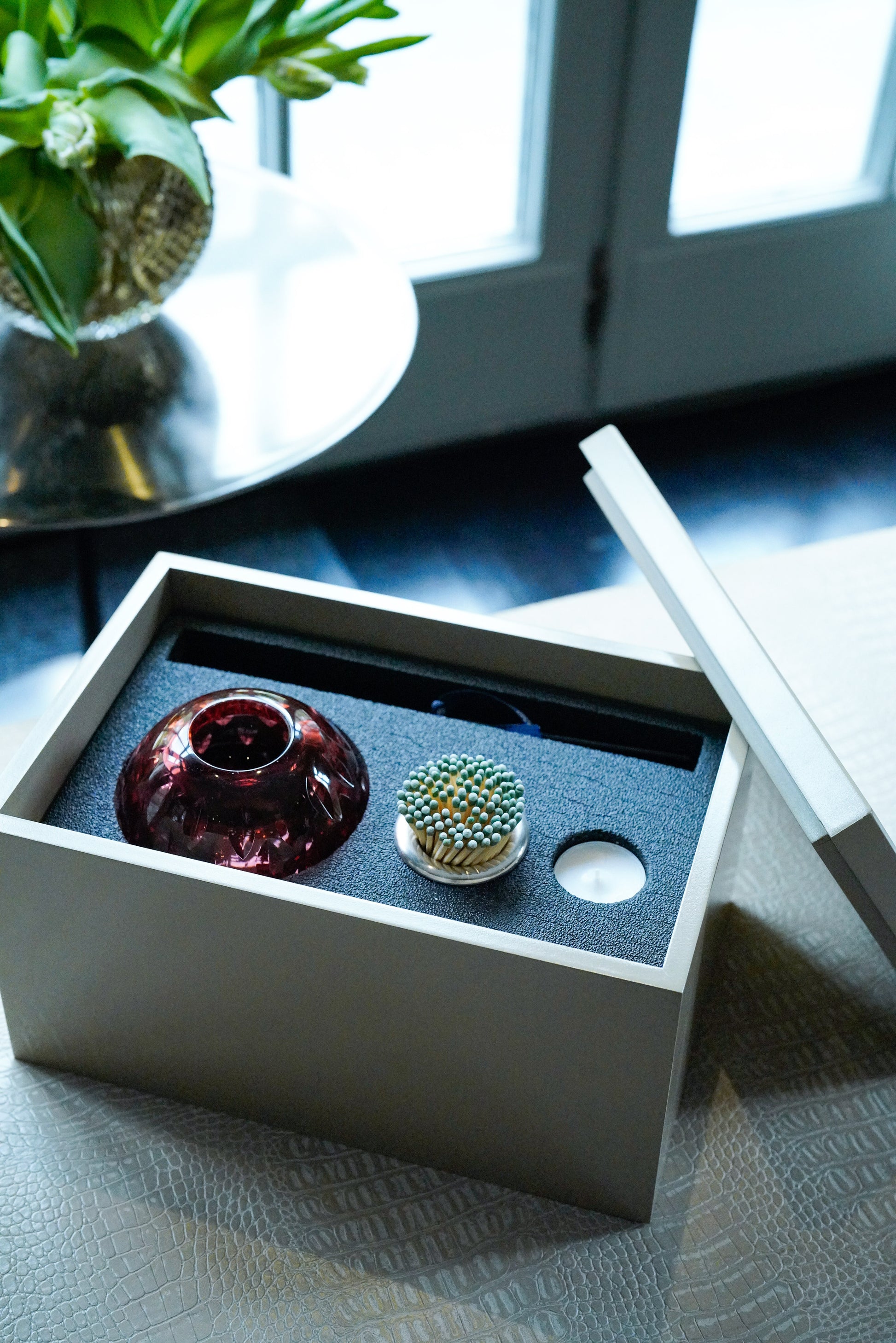 Gri renkli 4 kullanımı olan üfleme cam obje Ağız parçasının farklı kullanımları ile istendiğinde kibritlik, istendiğinde vazo, istendiğinde kokuluk veya tea light olarak kullanılır. 11 cm çap Gümüş kaplama ağız parçası ile