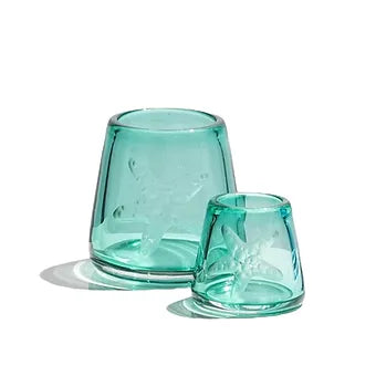 Mavi renkte, üzerinde deniz yıldızı dekorlu, rüzgar korumalı mumluk veya vazo olarak kullanmak üzere cam obje 9 cm çap 8,5 cm yükselik