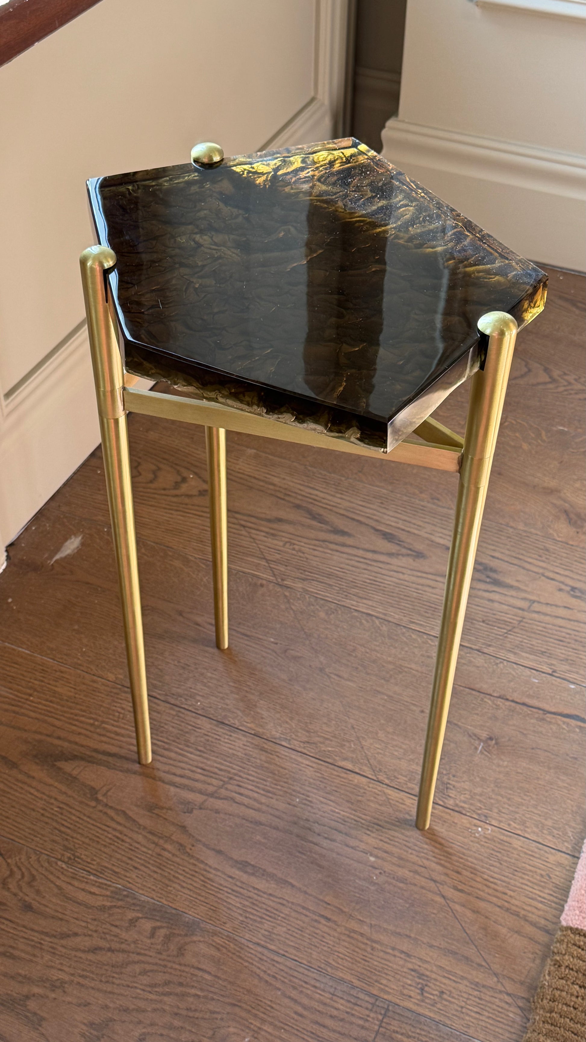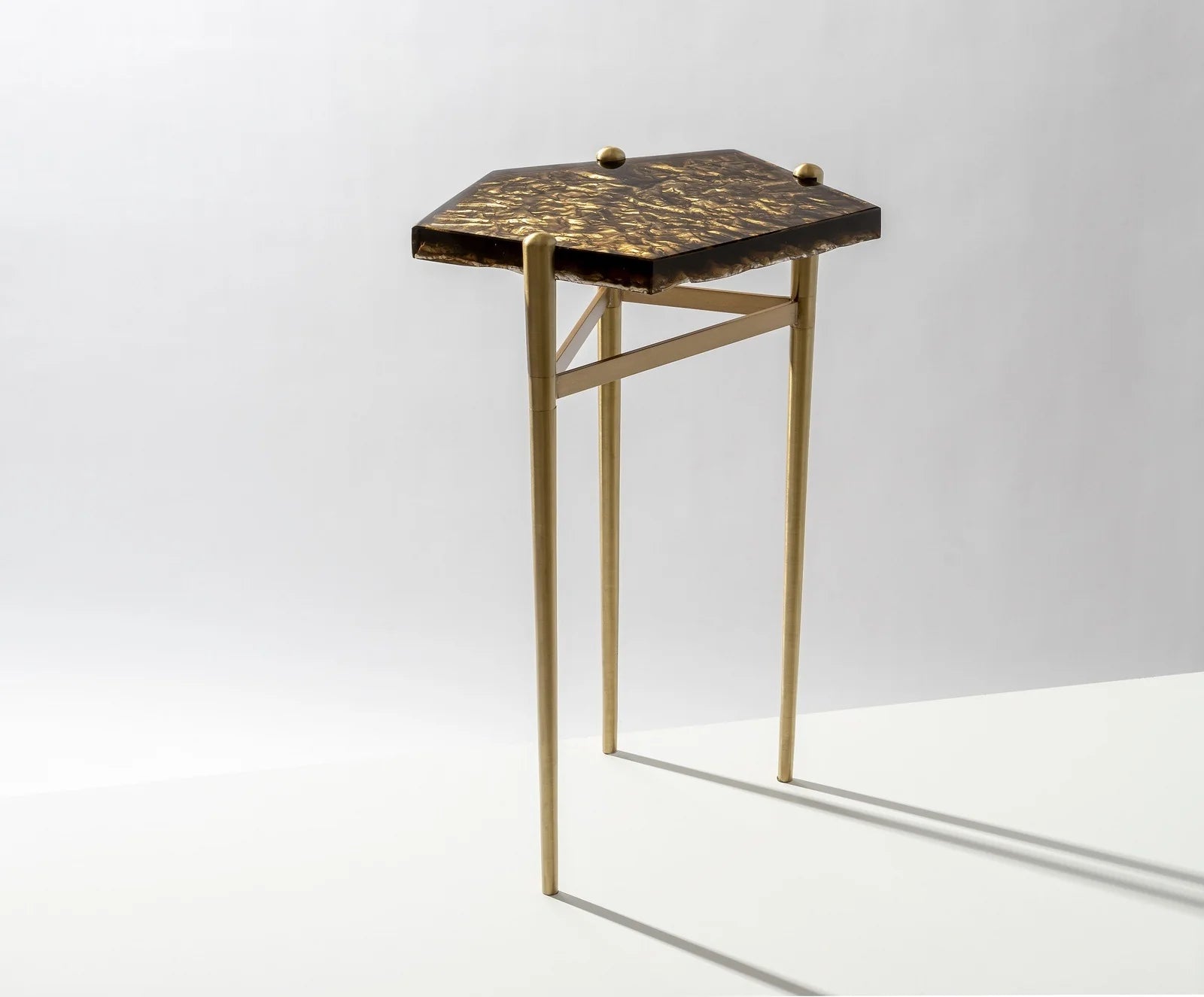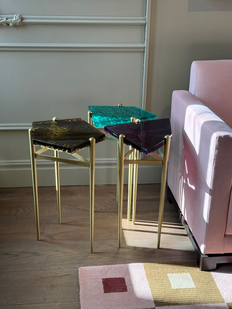 Özgün Yan Masa, form ve işlevi kusursuz bir şekilde harmanlayan tasarım ve işçiliğin zarif bir ifadesidir. Zümrüt, topaz ve ametist renkleri ile, değerli değerli taşların büyüleyici güzelliğini çağrıştırıyor.
