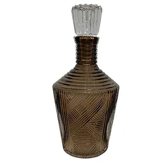 Şeffaf renkte siyah tıpası ile çevresinde Viyana esintili 20.yy. başı Josef Hoffman tasarımına ithafen desenler işlenmiş üflenmiş cam içki şişesi. Yükseklik 28 cm
