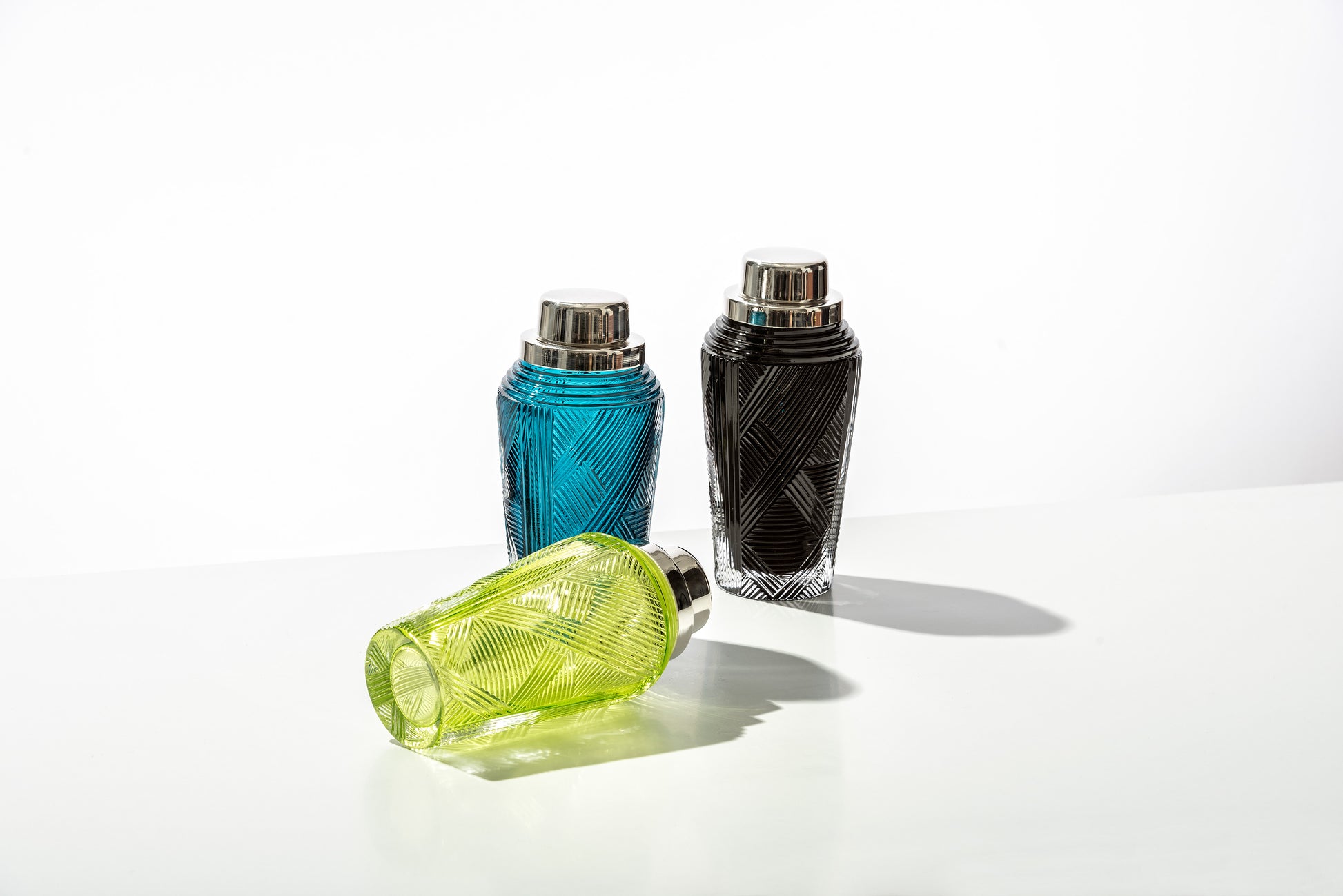 Limon yeşili renkte çevresinde Viyana esintili 20.yy. başı Josef Hoffman tasarımına ithafen desenler işlenmiş, üflenmiş cam shaker kokteyl çalkalayıcı Üfleme cam / gümüş kaplama metal kapak Yükseklik 22 cm