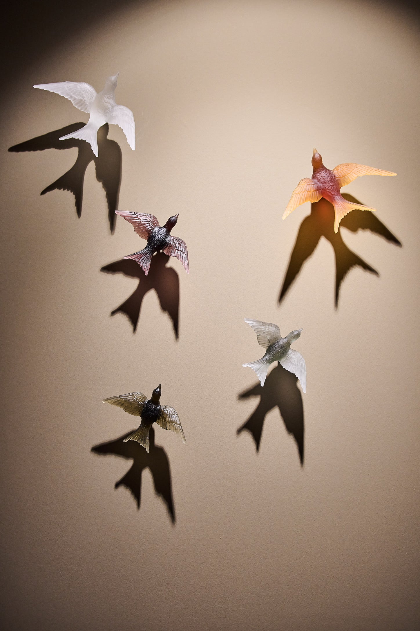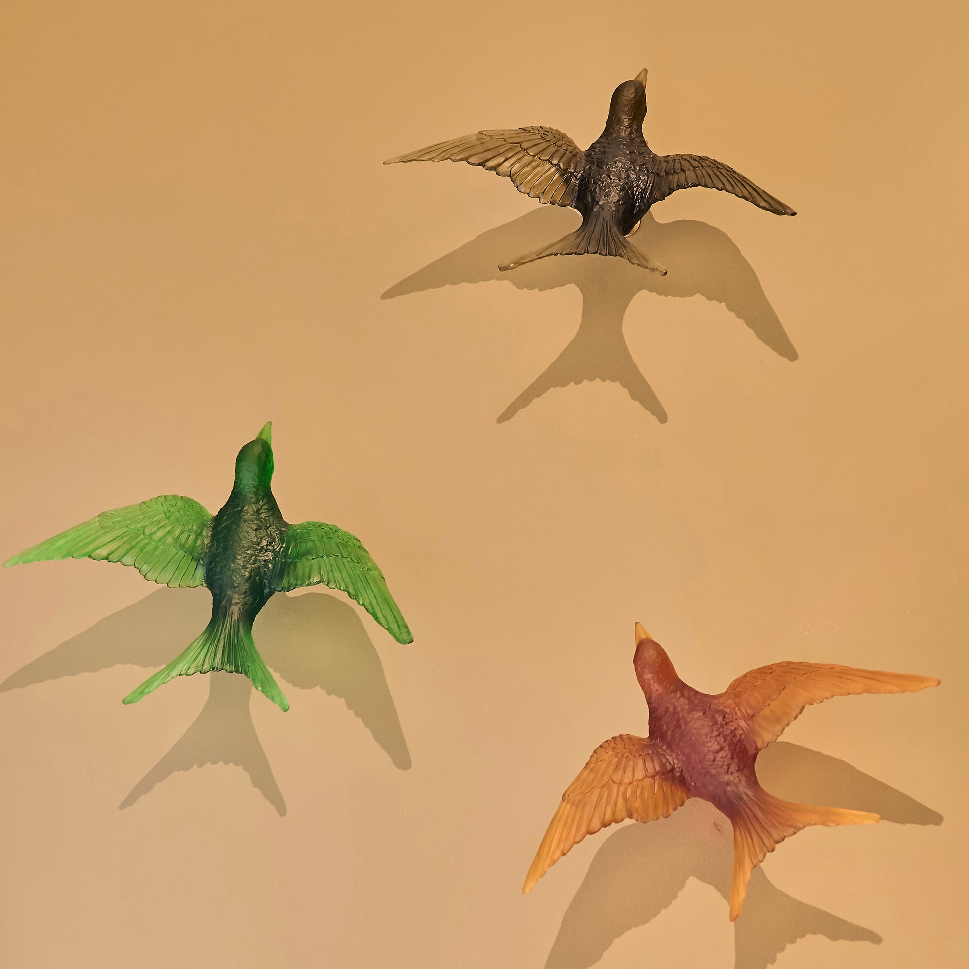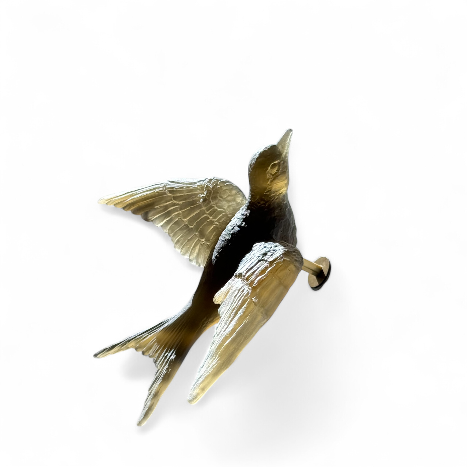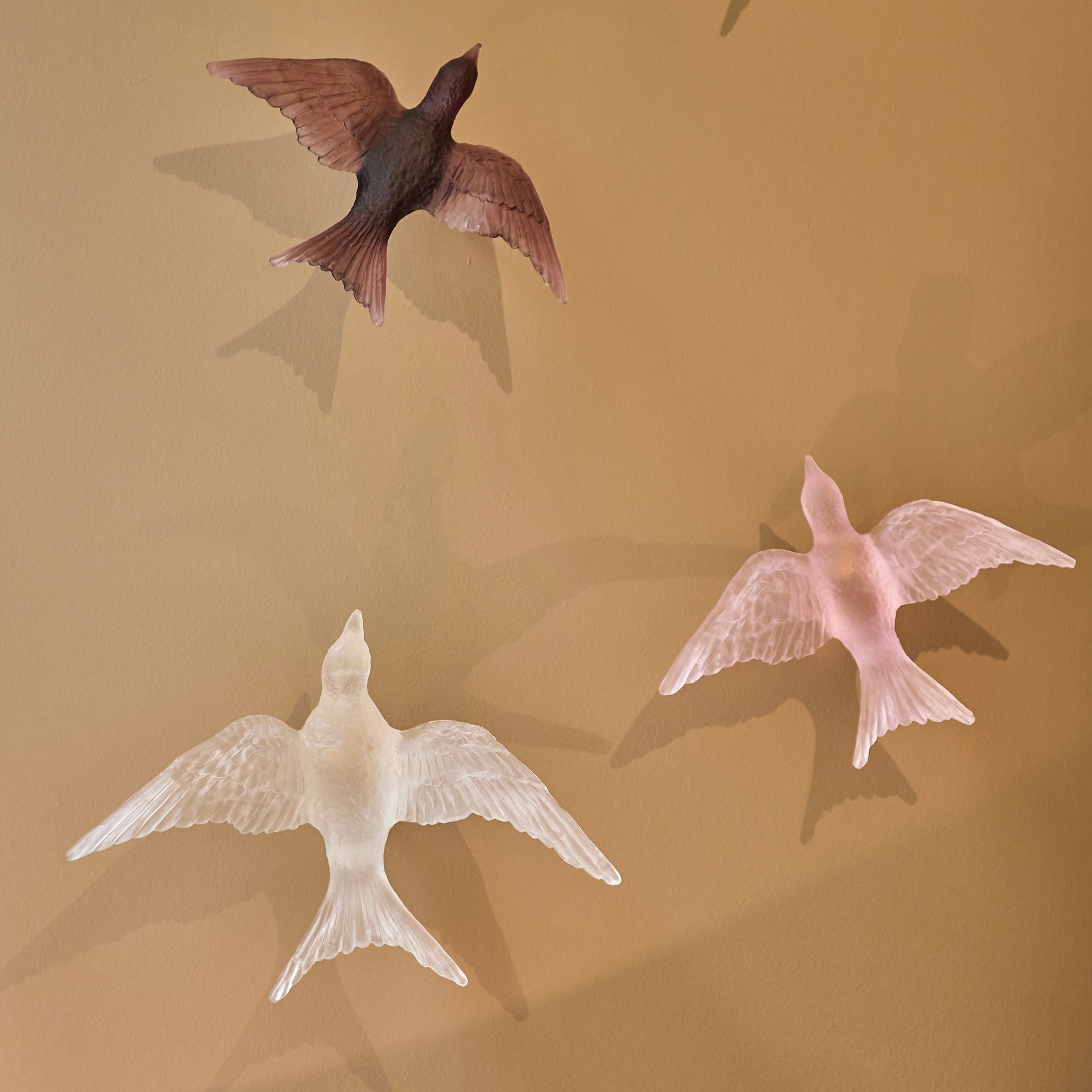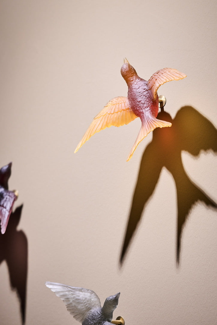 Pâte de verre tekniğiyle üretilen Kırlangıç Heykel, uçuş halindeki kırlangıçların hafifliğini ve özgürlük hissini camın yarı saydam doğasıyla buluşturur. Işığın cam yüzeyde yarattığı yumuşak geçişler, kuşların havadaki hareketini neredeyse donmuş bir an gibi görünür kılar.