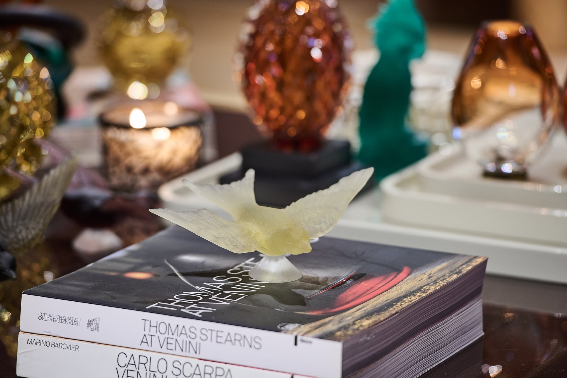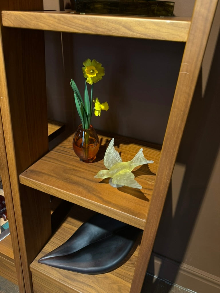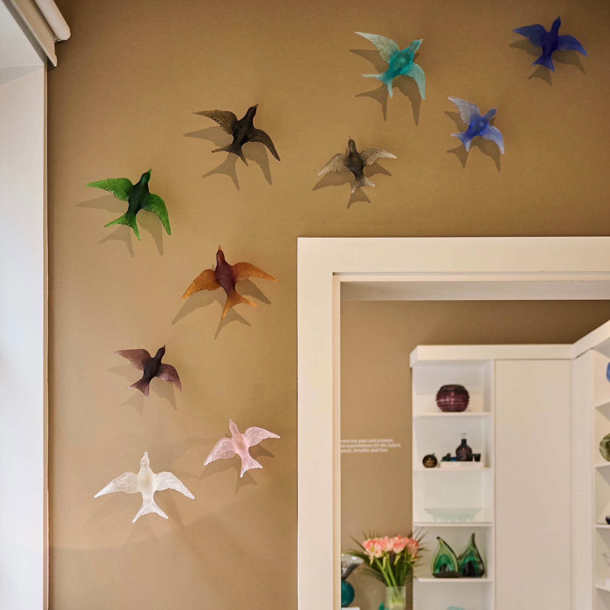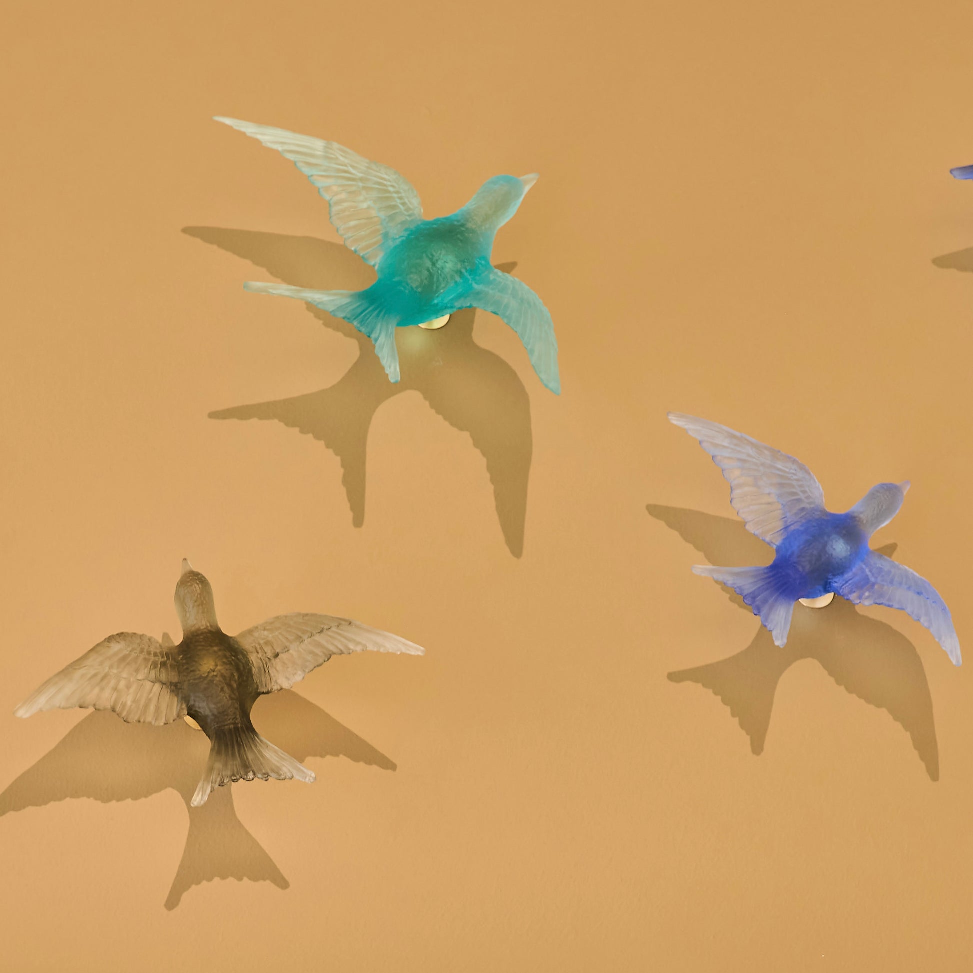 Pâte de verre tekniğiyle üretilen Kırlangıç Heykel, uçuş halindeki kırlangıçların hafifliğini ve özgürlük hissini camın yarı saydam doğasıyla buluşturur. Işığın cam yüzeyde yarattığı yumuşak geçişler, kuşların havadaki hareketini neredeyse donmuş bir an gibi görünür kılar.