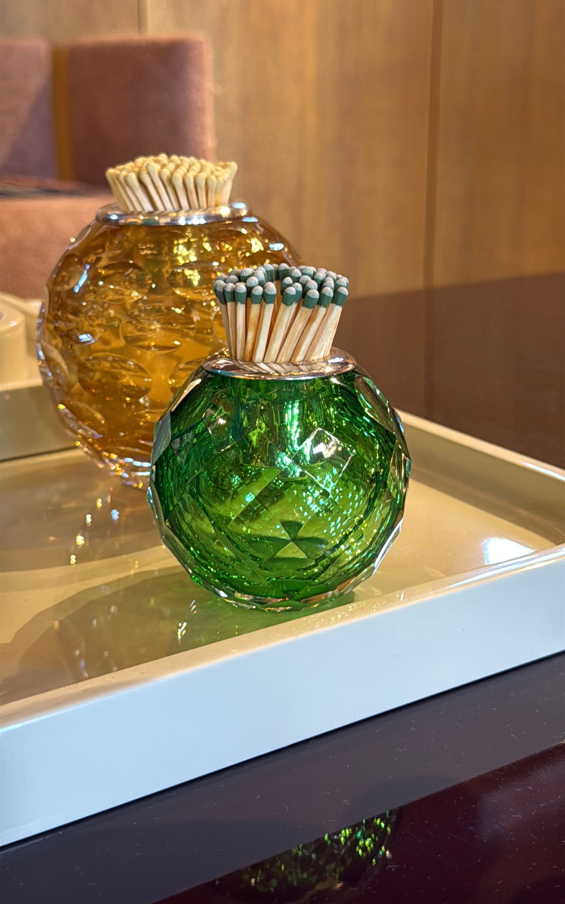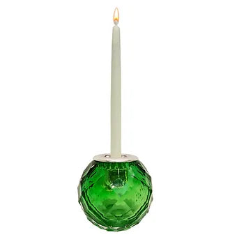 Çimen yeşili renginde istenirse mumluk istenirse kibritlik olarak kullanılabilecek üfleme cam obje Gümüş kaplama ağız parçası ile Çap 7 cm