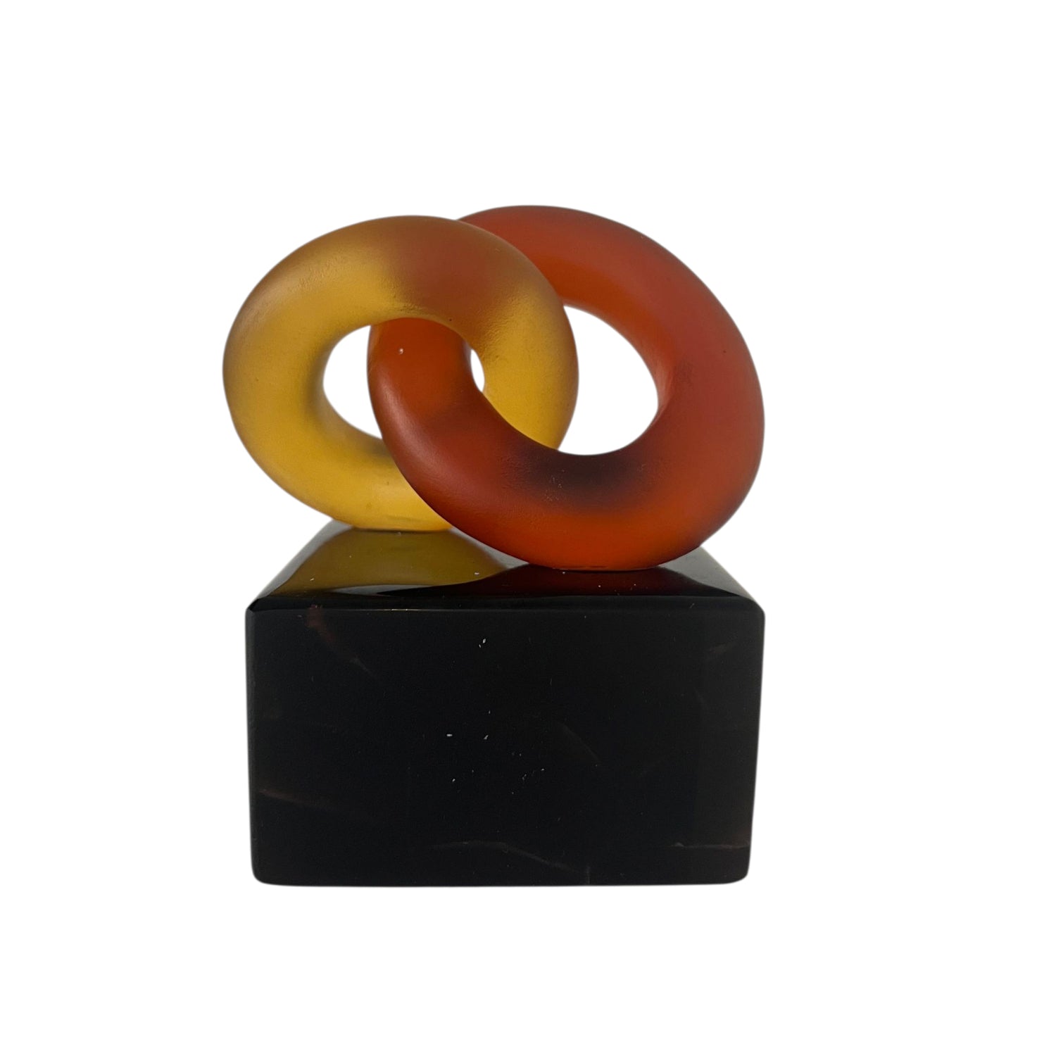 Koyu ve açık Amber düğüm siyah kaide ile 12 cm x 12 cm x 16 cm. Kalıpla şekillendirme cam