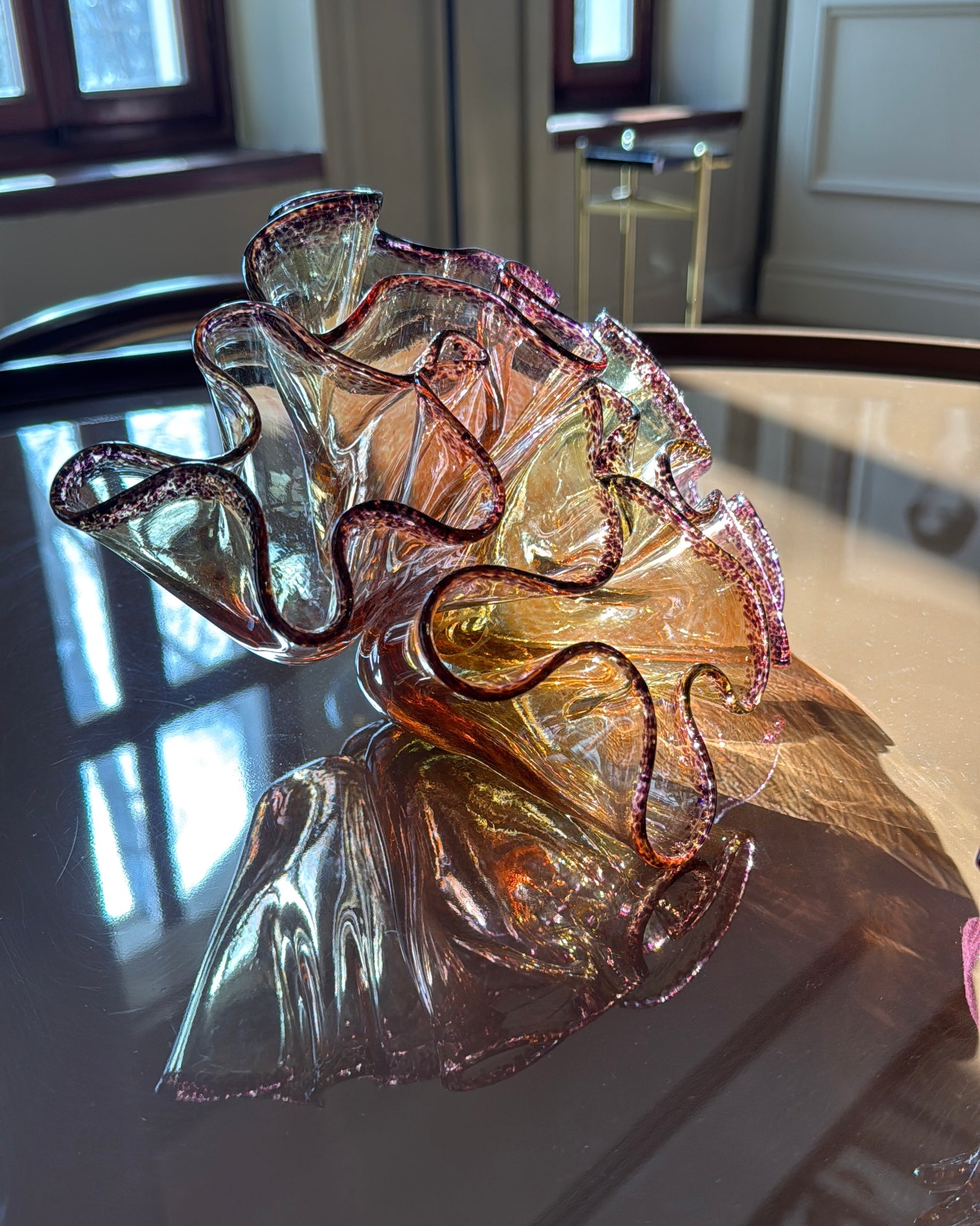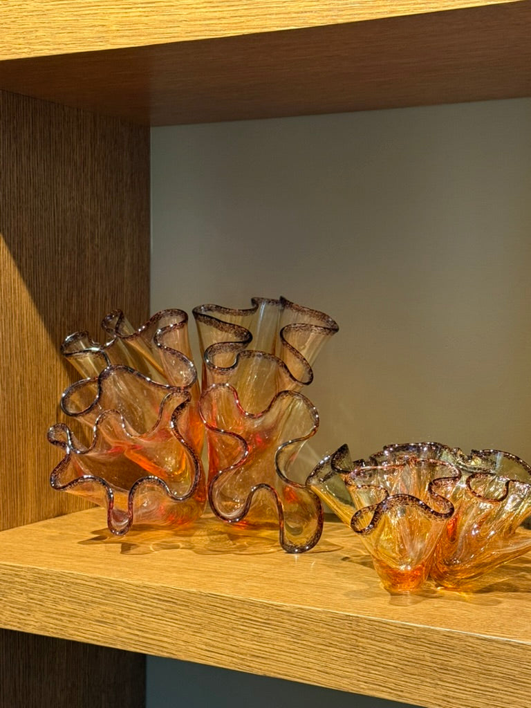 Amber/Günbatımı renkte sıcak cam şekillendirme tekniğinde yapılmış yaprak mercan cam heykel 22 cm genişlik 15cm yükseklik