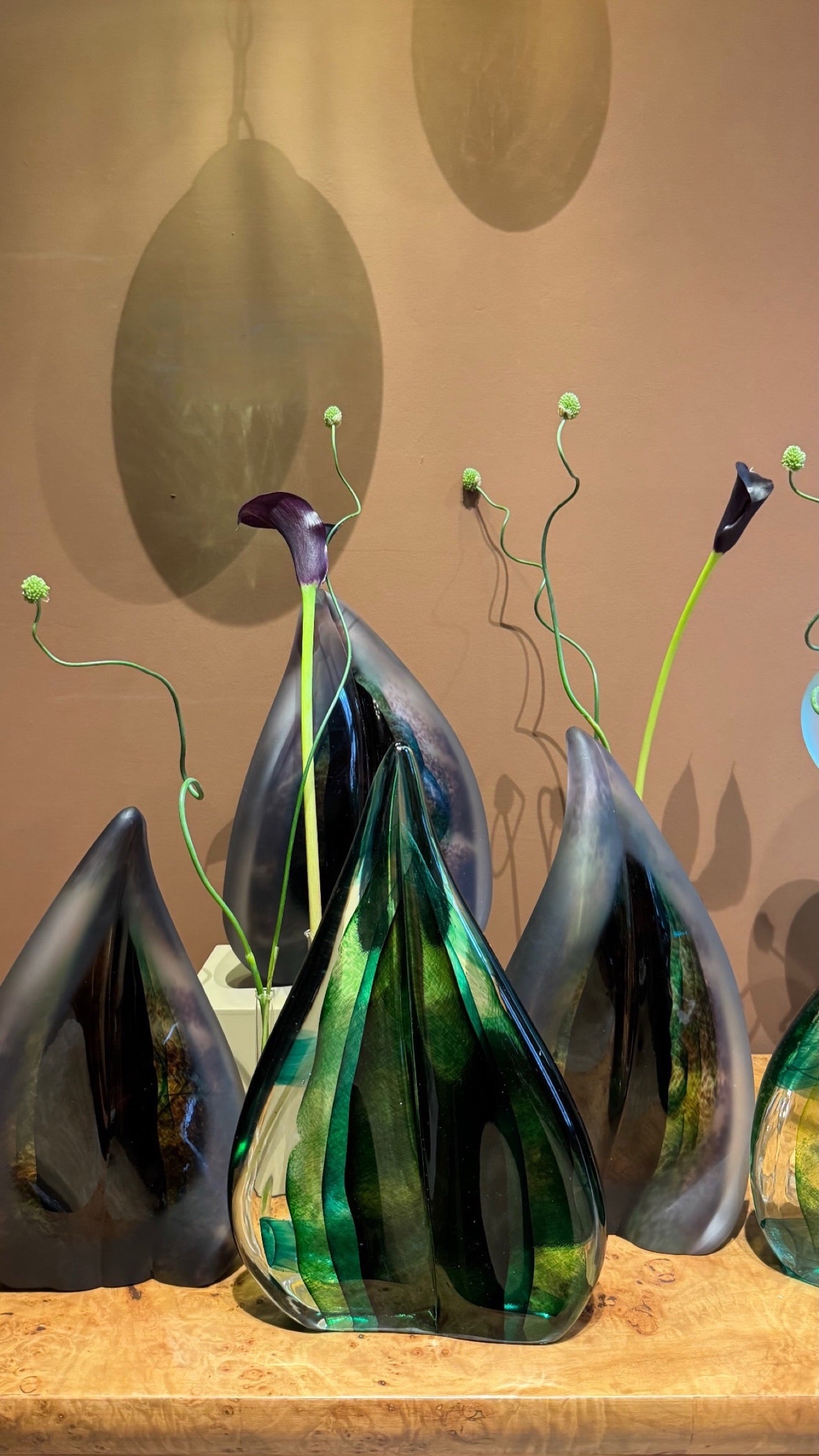 Farklı boyut ve tonlardaki yeşil cam formlar, dingin bir lagünde süzülen gala yaprakları hissi verir. İster tek başına, ister bir kompozisyon içinde sergilensin, bu lüks cam heykel her mekânda doğanın büyüleyici estetiğini yaşatır.